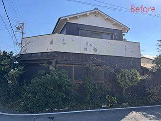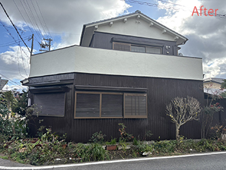 【担当のコメント】 木の塗装がめくれていたり、モルタル部分に至っては剥がれ落ちている状態でした。 しっかりケレン作業をした上で、後の剥がれが起こらない様下地処理をしています。 雨樋や波板が雹被害によって穴が開いておりましたので、取替工事もしました。 担当:森園