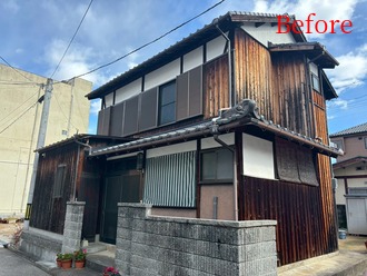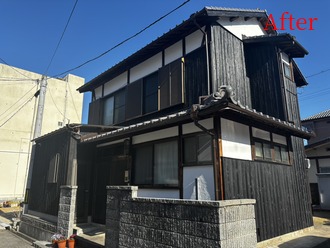 【担当のコメント】 焼板・漆喰の塗装です。 木部塗装でありがちな浸�透系の塗料ではムラが出やすい為、 キシラデコールコンゾランという、造膜系の塗料で塗りました。 仕上りが黒一色で均一になり、焼板の風合いを取り戻しました。 担当:森園